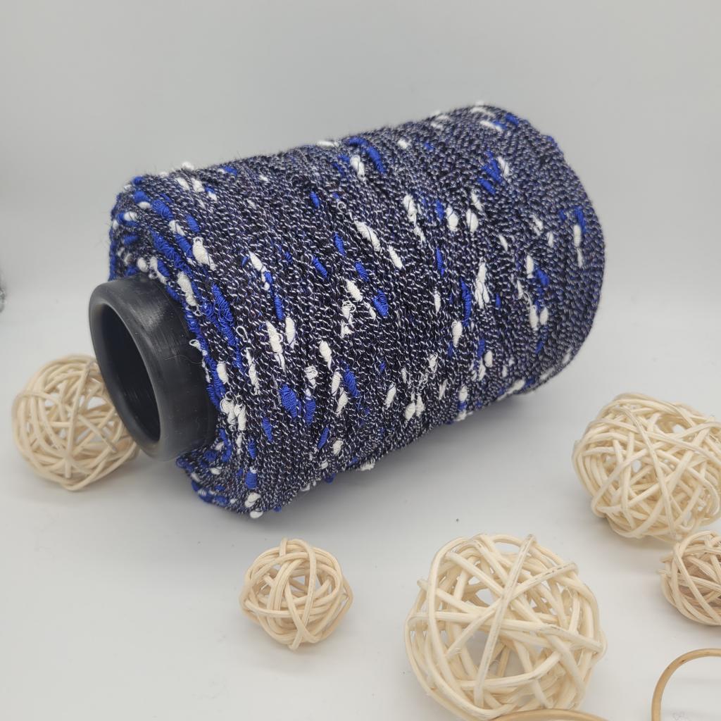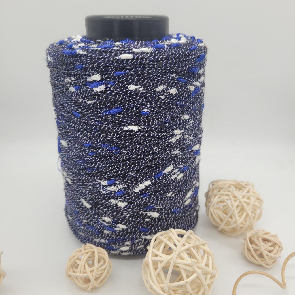 Итальянская пряжа в бобинах. На нитке идут утолщения "шишибрики" синего и белого цветов в сочетании с темно-синими пайетками 3мм, которые эффектно смотрятся вязаном полотне.