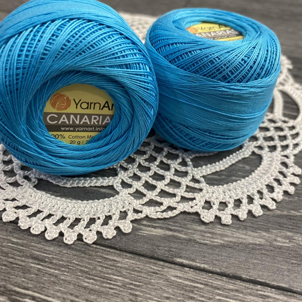 ЯрнАрт канариас 5 мотков. Тонкий мерсеризованный хлопок для летнего вязания. Ровная, хорошо скрученная нить. Область применения: кружево, салфетки, скатерти, микроамигуруми, бельё крючком. Классическая пряжа для салфеток, скатертей, ажурных воротничков и других изделий, где важно, чтобы ниточка была тоненькая, но в то же время крепкая. На вязаном образце 10х10см получается 42 ряда по 24 петель. Пряжа для вязания YarnArt Canarias. Canaris от YarnArt популярная пряжа на лето. В своём составе Канарис имеет 100% хлопок, хлопковая пряжа не пилингуется - это означает, что изделие из нее можно неоднократно распускать и перевязывать снова. Производители рекомендуют спицы №2-2.5. Состав: 100% мерсиризованный хлопок.