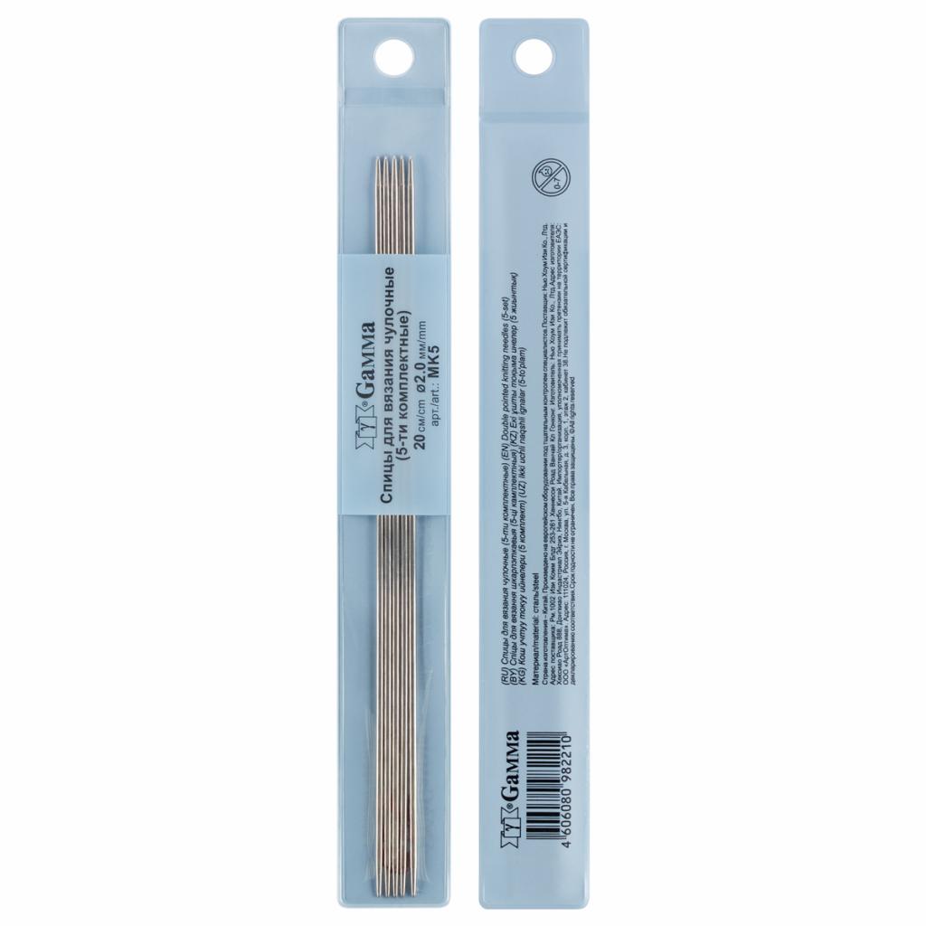 Спицы 5-ти комплектные "GAMMA" арт. MK5 сделаны из высокопрочной стали. Спицы прочные, легкие, гладкие, удобные в использовании. Кончики спиц закругленные, ровные. Спицы 5-ти комплектные предназначены для вязания шапочек, варежек и носков. Комплект спиц упакован в чехол синего цвета с этикеткой и штрих-кодом. Состав: металл