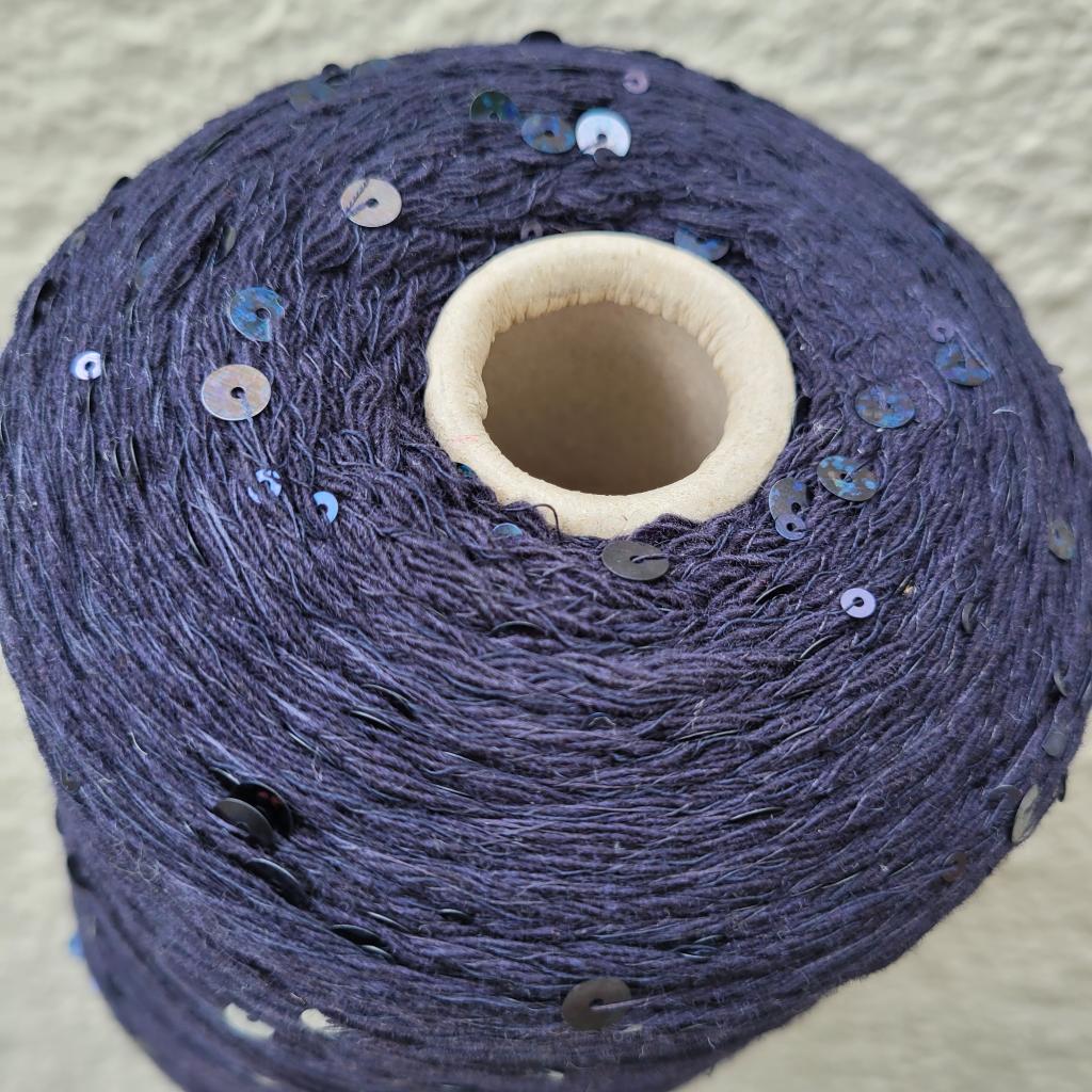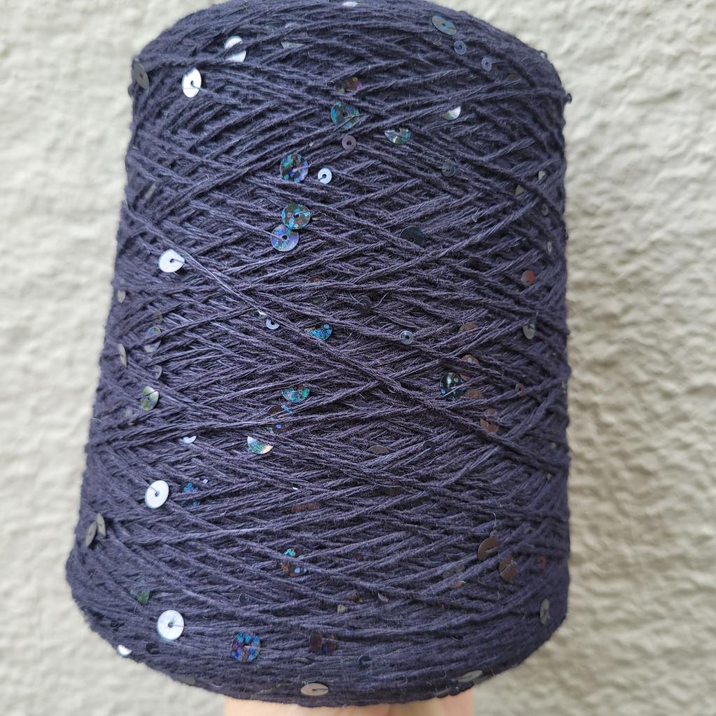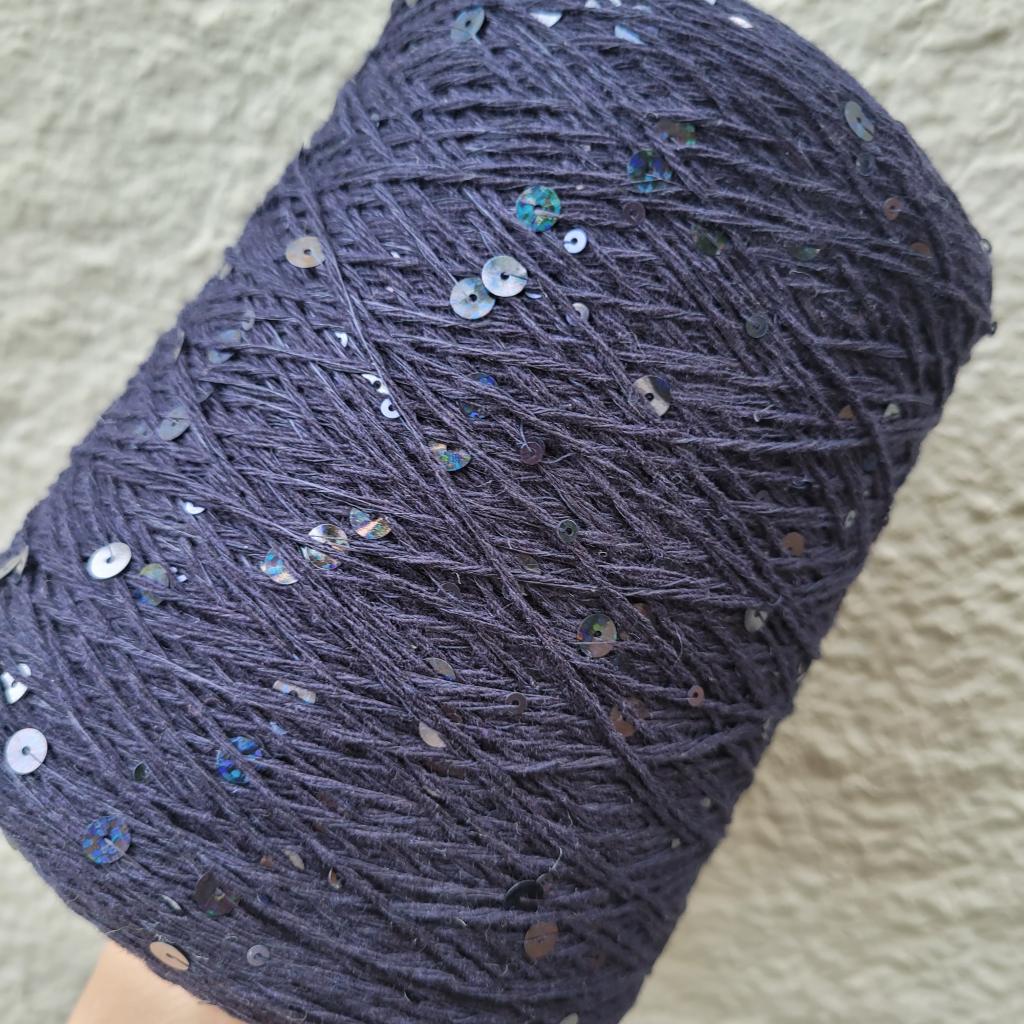 Ниточка мериноса темно-синего цвета с пайетками в цвет пряжи.