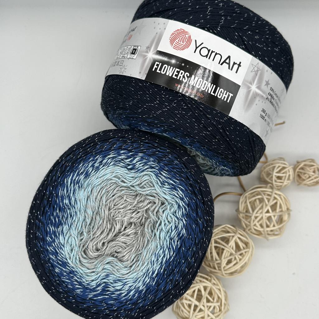 Пряжа секционного окрашивания с люрексом YarnArt Flowers Moonlight ( ЯрнАрт Фловерс Мунлайт ) это прекрасный вариант для летнего изделия, которое согреет прохладным летним вечером и станет ярким украшением на вашем празднике. Причем это не машинное окрашивание с резкой сменой цвета. Фловерс мунлайт состоит из 4 тонких ниточек и смена цвета происходит путем постепенного добавления нитей, сначала заменяется одна из 4-х, затем добавляется вторая, третья. Легкая и нежная пряжа для вязания, в полотне ложится в виде градиентного орнамента. Изделия хорошо драпируется, отлично подойдет для вязания шали, яркого бактуса, необычного платья или незабываемой туники. Нитка состоит из четырех ниточек слабой крутки и одной нитки люрекса. Для работы рекомендованы спицы №2,5-2,75 и крючок №3. Достоинства moonlight: летний состав, прекрасное сочетание хлопка и полиэстра; метраж, отличный расход; цветовая гамма; не линяет; изделия не деформируются, после стирки; мягкая пряжа; простота в уходе. Состав: 53% хлопок 43% полиакрил 4% люрекс