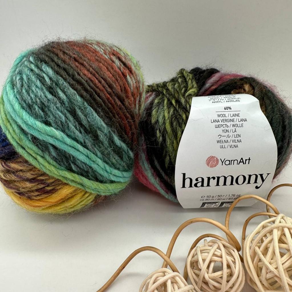 Yarnart harmony ( Ярнарт Гармония ) яркая пряжа для вязания, объемная полушерстяная ровница. YarnArt Harmony - это полушерсть с добавлением акрила, нить средней толщины, имеет рыхлое кручение. Входит в зимнюю серию. Яркие сочные цветовые переходы придутся по вкусу тем, кто любит отдохнуть на вязании лицевой глади. Ведь для таких расцветок не нужны сложные узоры. Подходит для создания теплых вещей: свитеров, кардиганов, пальто, варежек, митенок, гетр, шарфов, снудов и шапок. Секционное крашение придает даже обычной глади нарядность и великолепный внешний вид.