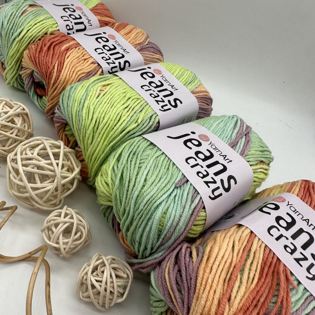 Пряжа YarnArt Jeans Crazy (Ярнарт Джинс Крейзи) - полухлопок в сочетании с полиакрилом. Нить средней скрутки, состоит из четырех волокон, ровная, бархатистая. В работе не расслаивается, полотно получается мягким. В мотке сочетаются три основных цвета с оттенками. В готовом изделии пряжа раскладывается в пестрый рисунок в виде штрихов и полос. Подходит для создания летнего гардероба и вещей на межсезонье. Хорошо смотрятся пледы, предметы интерьера, игрушки. Рекомендована для вязания новорожденным и людям с чувствительной кожей. Пряжа Ярн Арт Jeans Crazy мягкая и приятная на ощупь, состоит наполовину из высококачественного хлопка, с добавлением полиакрила что позволяет изделию отлично держать форму, придает устойчивость к усадке. Пряжа имеет яркое секционное окрашивание, сохраняет цвет после стирки.