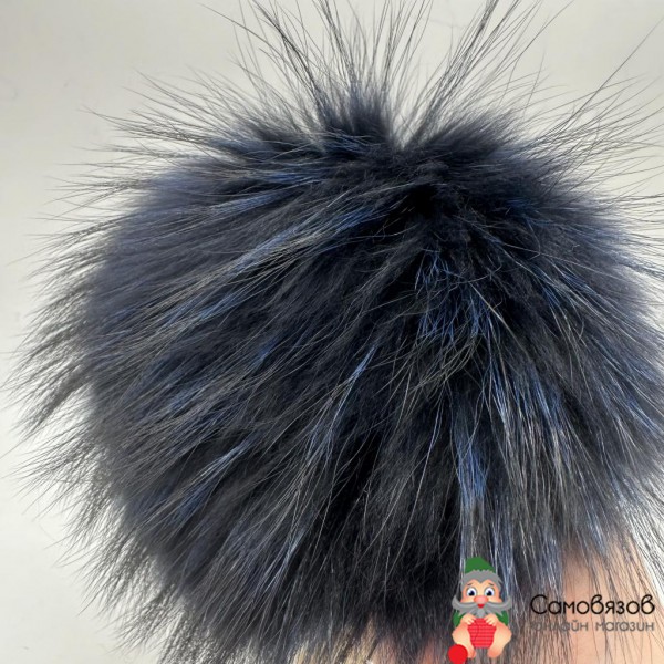 Аксессуары для одежды и обуви Помпон из натурального меха (енот), d-16-18 cм "помпон натуральный черный с синими кончиками"