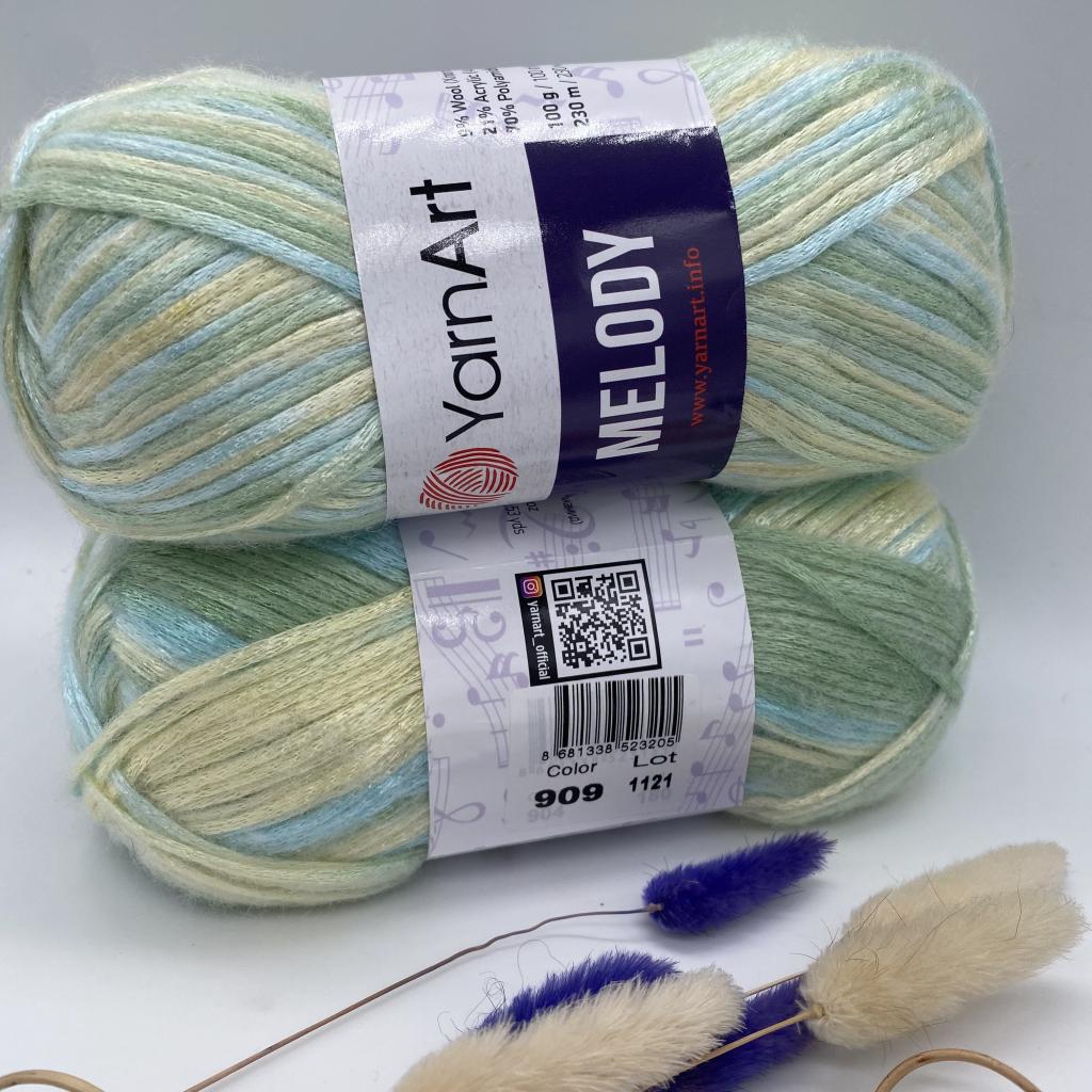Melody это мягкая пряжа с небольшим содержанием шерсти в составе. Нить оригинального плетения, благодаря полиамиду имеет мягкий приглушенный блеск. Шерсть дает согревающие свойства, акрил - прочность и мягкость, полиамид - нарядный, эффектный блеск и шелковистость. Используйте yarnart melody для вязания свободных вещей на межсезонье - снудов, шарфов, накидок. Вещи из ЯрнАрт Мелоди подарят Вам тепло и уют. Рекомендуется использовать спицы №4-5. Состав: 9% шерсть, 21% акрил, 70% полиамид