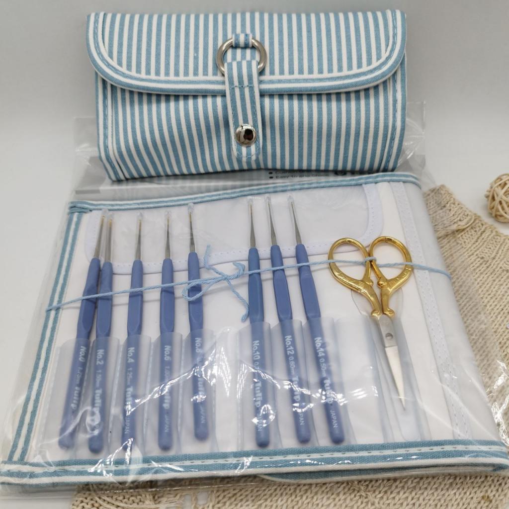 Набор крючков для вязания "ETIMO" (в наборе: органайзер (100% полиэстер), крючки (0,5мм, 0,6мм, 0,75мм, 0,9мм, 1мм, 1,25мм, 1,5мм, 1,75мм), линейка, ножницы, иглы в ассортименте 2шт), сталь/пластик, серебристый/голубой, 8 крючков в наборе