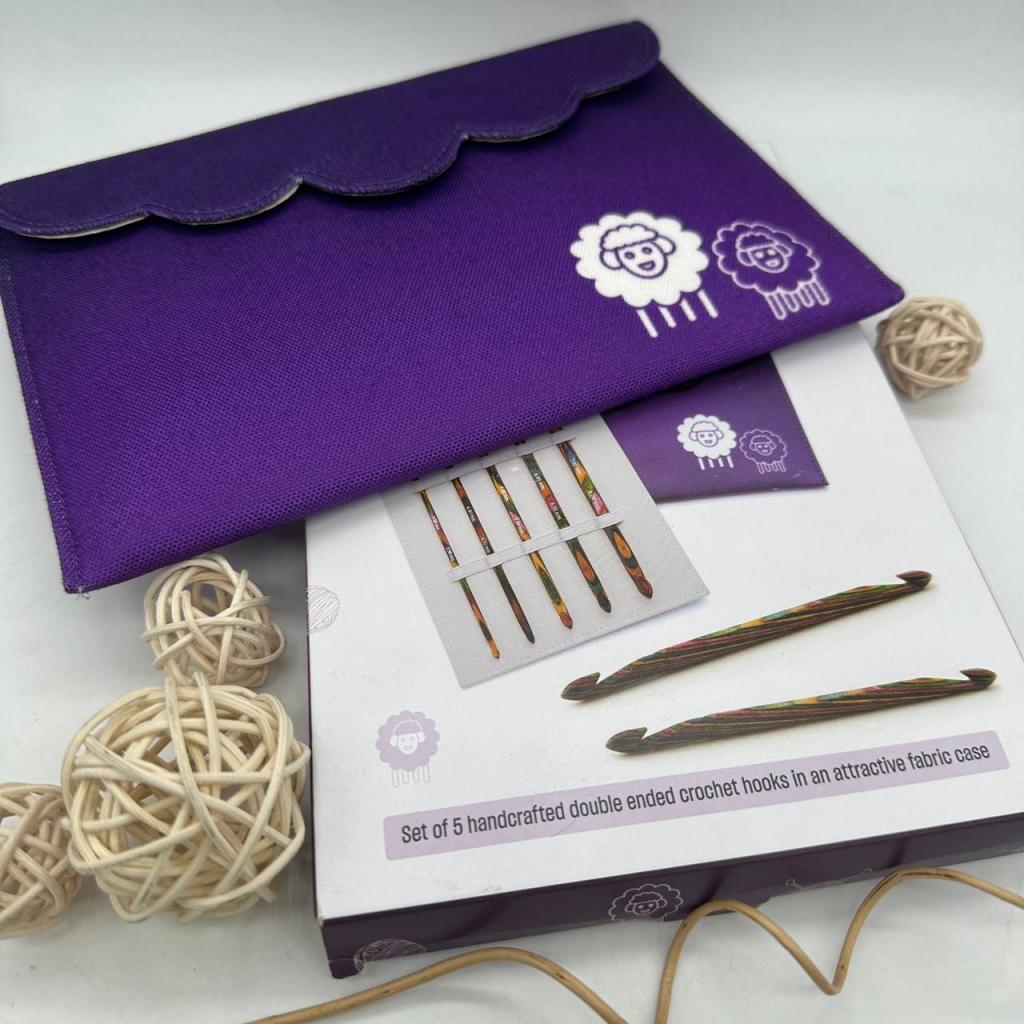 Крючки: деревянные двухсторонние крючки Symfonie 10 размеров: 3.0-3.5 мм, 4.0-4.5 мм, 5.0-5.5 мм, 6.0-6.5 мм, 7.0-8.0 С умочка фиолетового цвета, украшенная красивым краем с изображениями овечек.