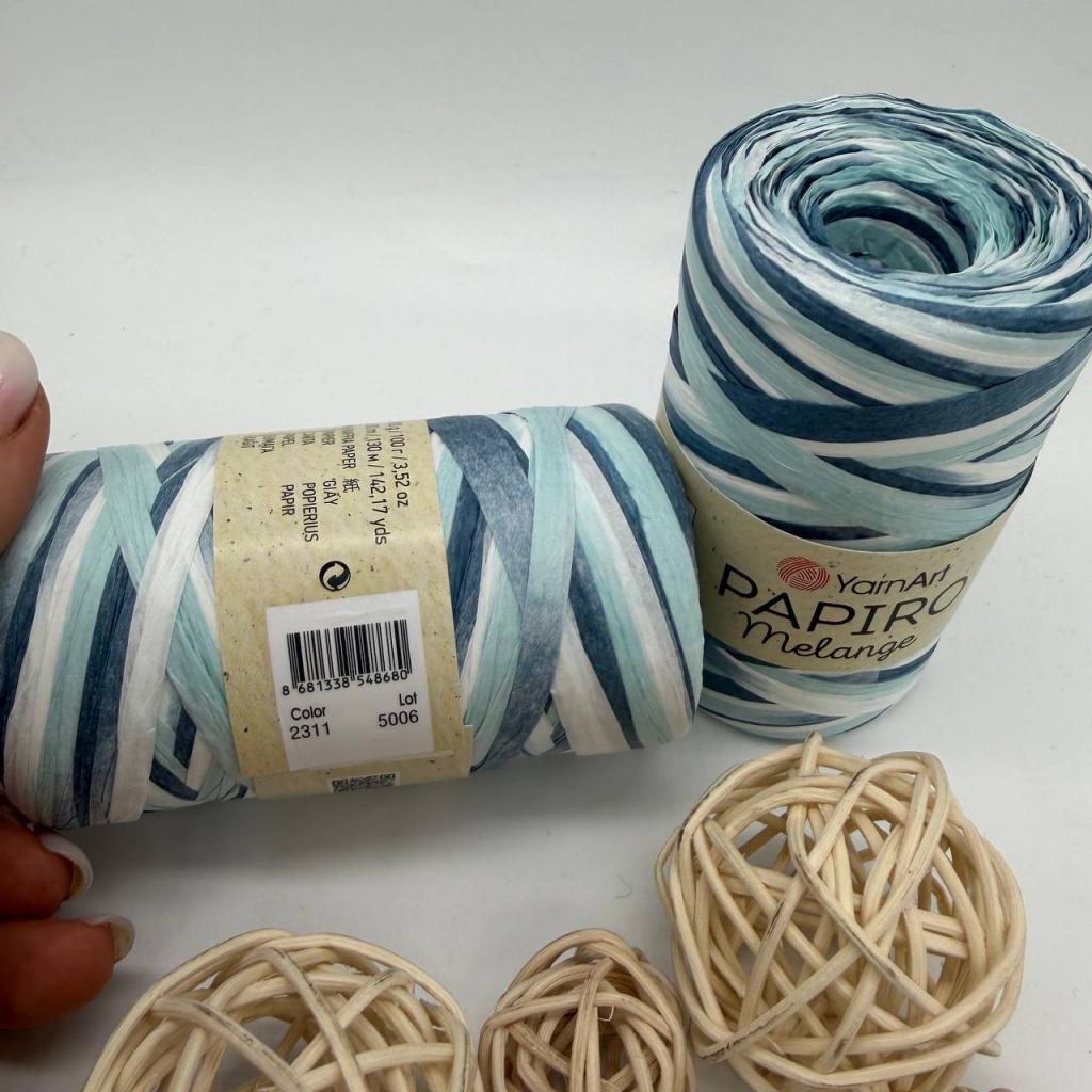 Одна из самых необычных ниточек - изготовлена из пресованной бумаги. Т.е. на 100% экологична! Состав: 100%древесное волокно(бумага)