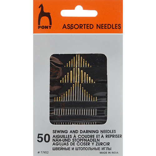 Набор Pony 'Ассорти' включает в себя 50 ручных швейных игл разных видов, предназначенных для различных целей, включая мелкий ремонт одежды, наметку и вышивание.